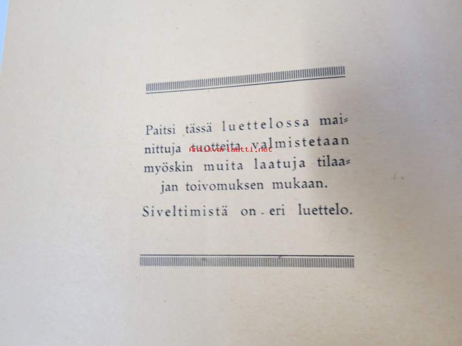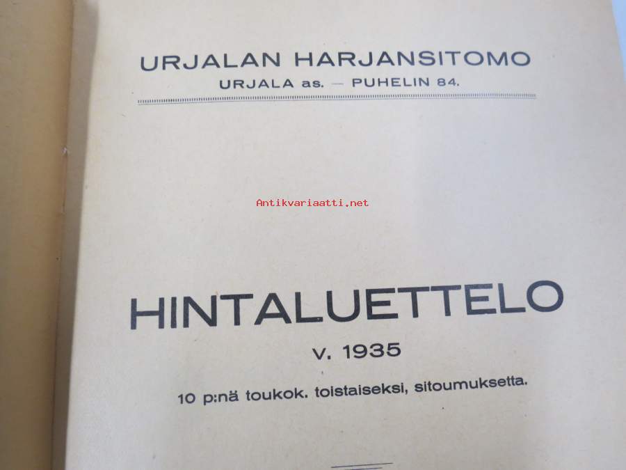 Urjalan Harjansitomo - Hintaluettelo v. 1935 -tuotelulettelo / kuvasto