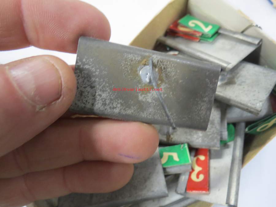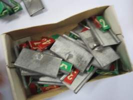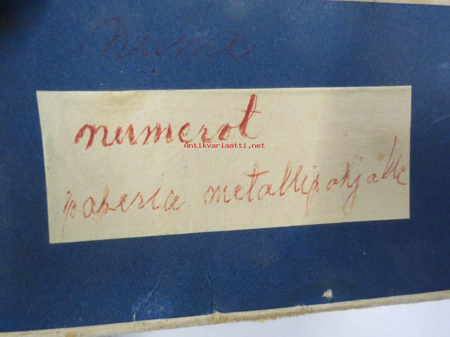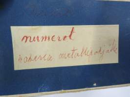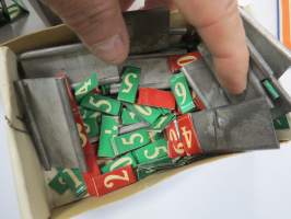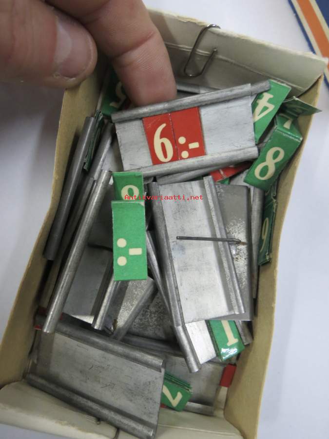Hintalappupohjia, metallisia + erillisiä paperisia numeroita, kauppojen hintojen merkitsemiseen näyteikkunoissa ja hyllyissä tarkoitettuja, arviolta noin 40-lukuisia