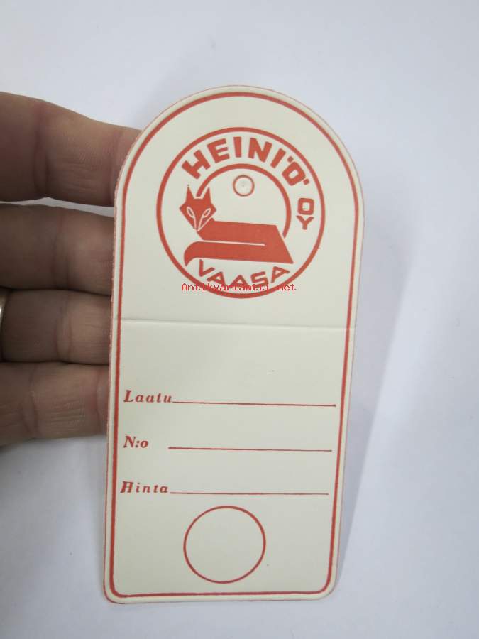 Heiniö Oy - Vaasa -hintalappu / tuotetietolappu, merkin valmistaja Herman Mattsson Korkokuvapaino & Pussitehdas, Vaasa