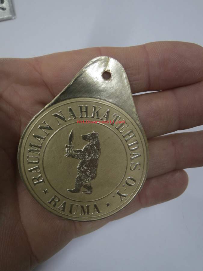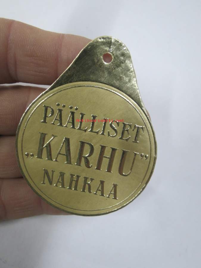 Päälliset "Karhu" nahkaa - Rauman Nahkatehdas Oy -hintalappu / tuotetietolappu, merkin valmistaja Herman Mattsson Korkokuvapaino & Pussitehdas, Vaasa