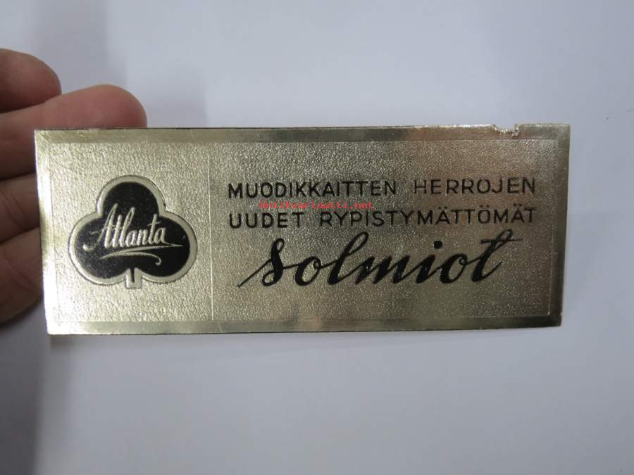 Atlanta - Muodikkaitten herrojen uudet rypistymättömät solmiot -hintalappu / tuotetietolappu, merkin valmistaja Herman Mattsson Korkokuvapaino & Pussitehdas, Vaasa