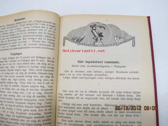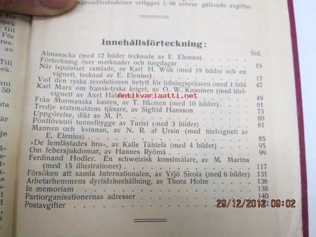 Socialdemokratiska Partibyråns Förlag, 1917 Folk kalender VIII 1918, innehåller mm. följande artikel; När ispalatset ramlade, Från Murmanska kusten, Pönttövuori tunnelbygge, Vad den ryska revolutionen betytt för tidningsprässen 13 x 19 cm.