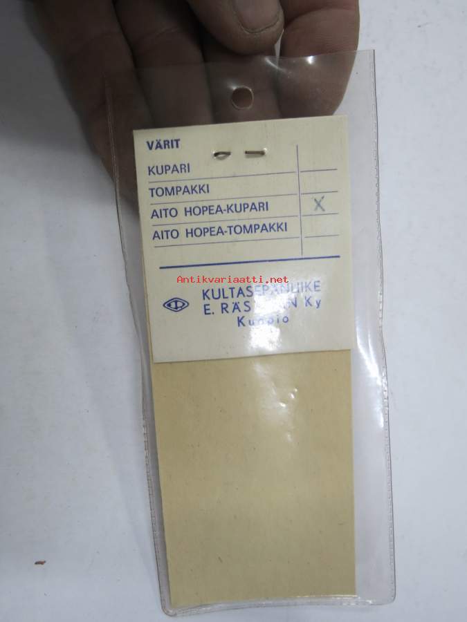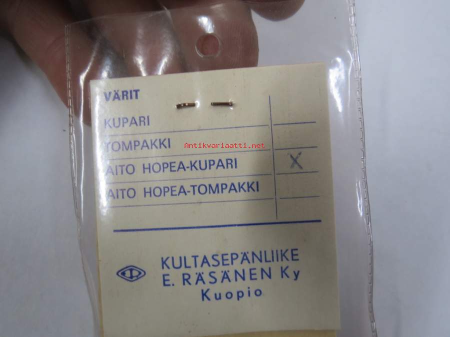 Raju - Kultasepänliike E. Räsänen Ky, Kuopio -pilkki, väri "Tompakki", käyttämätön, alkuperäispakkauksessaan