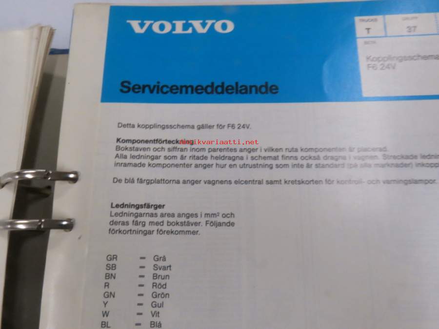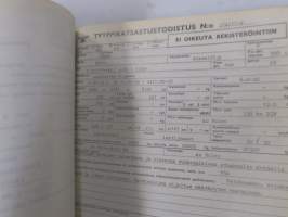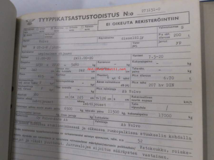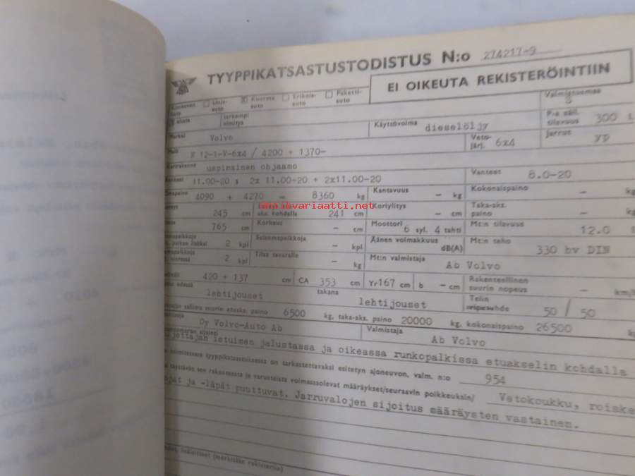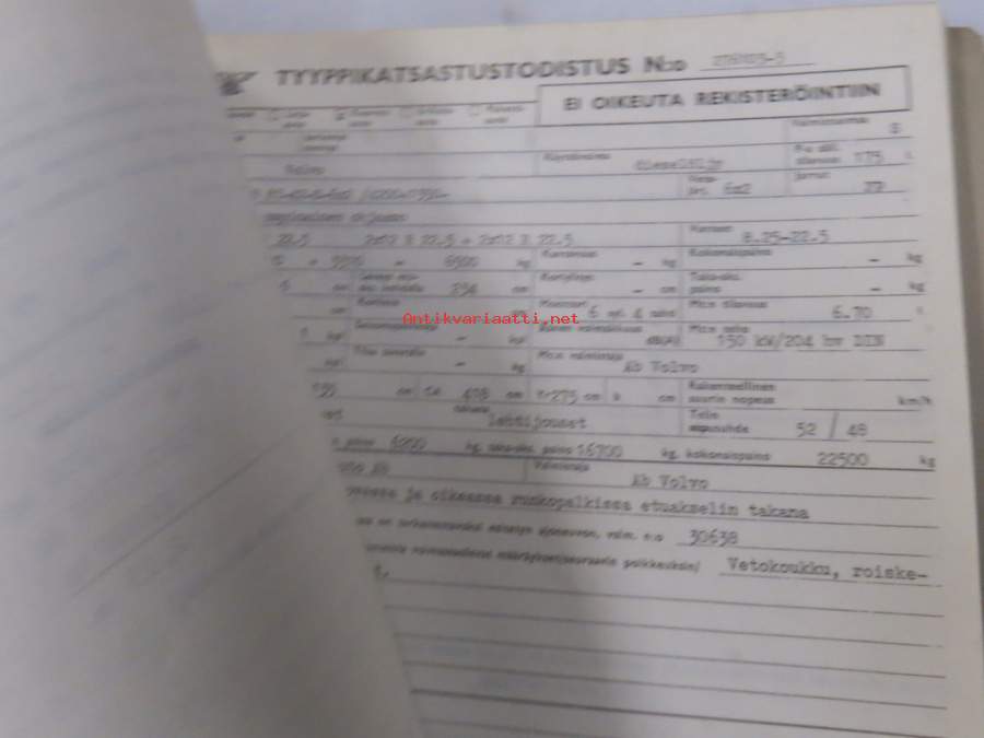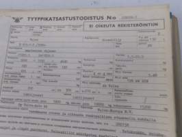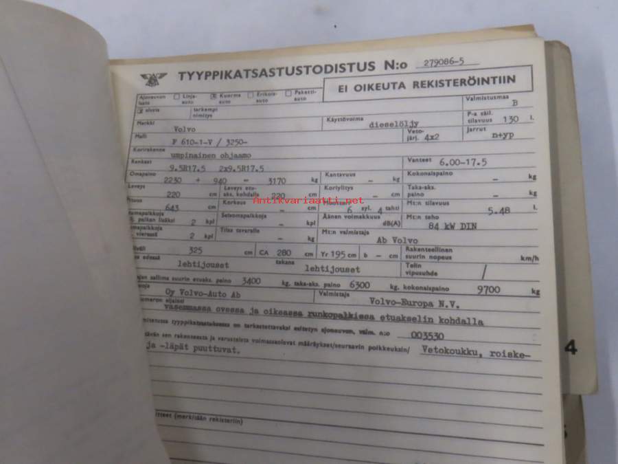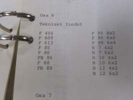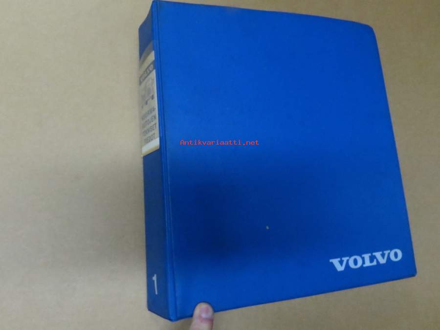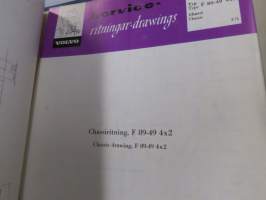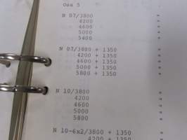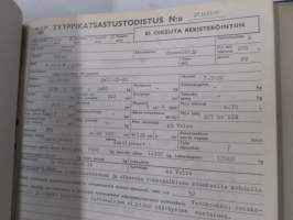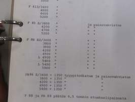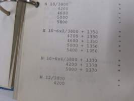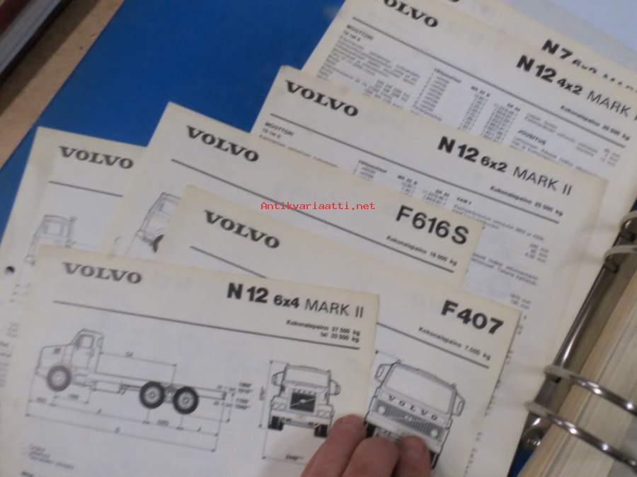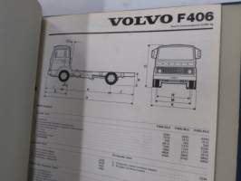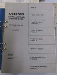 Volvo kuorma-autojen tekniset tiedot -kansio, sisältää myös tyyppikatsastustodistuksia, huoltotiedotuksia ym. ison määrän