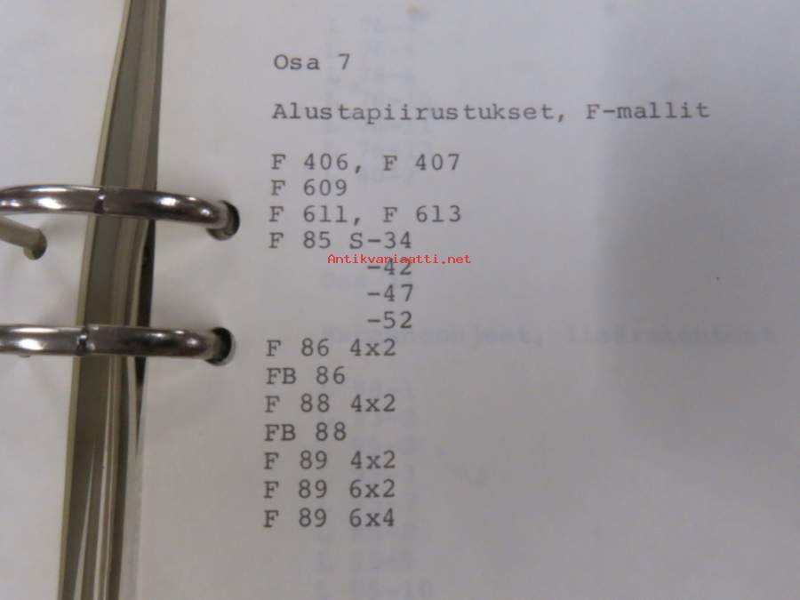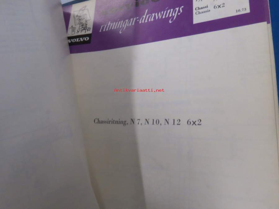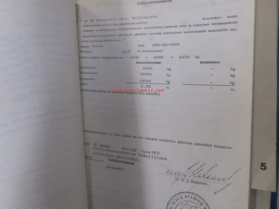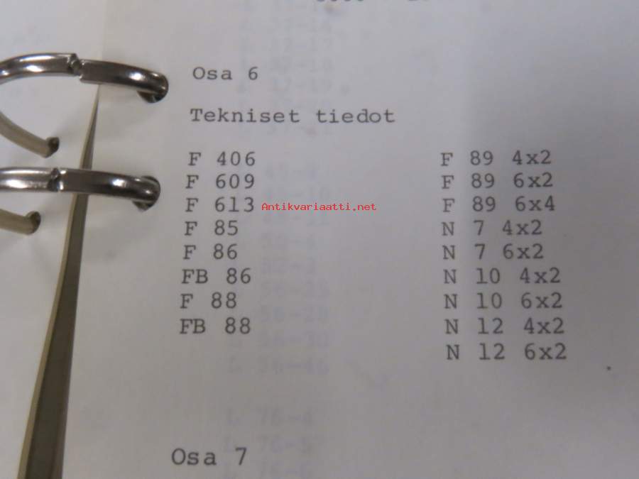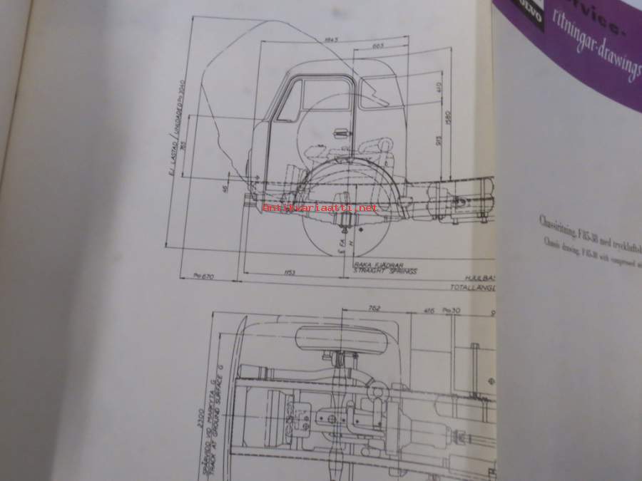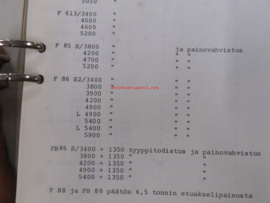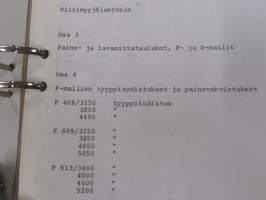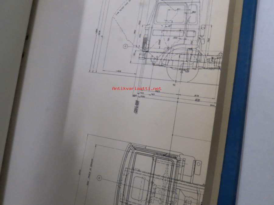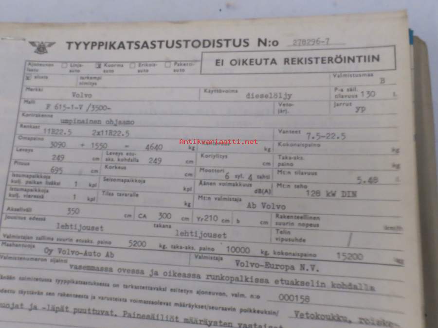 Volvo kuorma-autojen tekniset tiedot -kansio, sisältää myös tyyppikatsastustodistuksia, huoltotiedotuksia ym. ison määrän