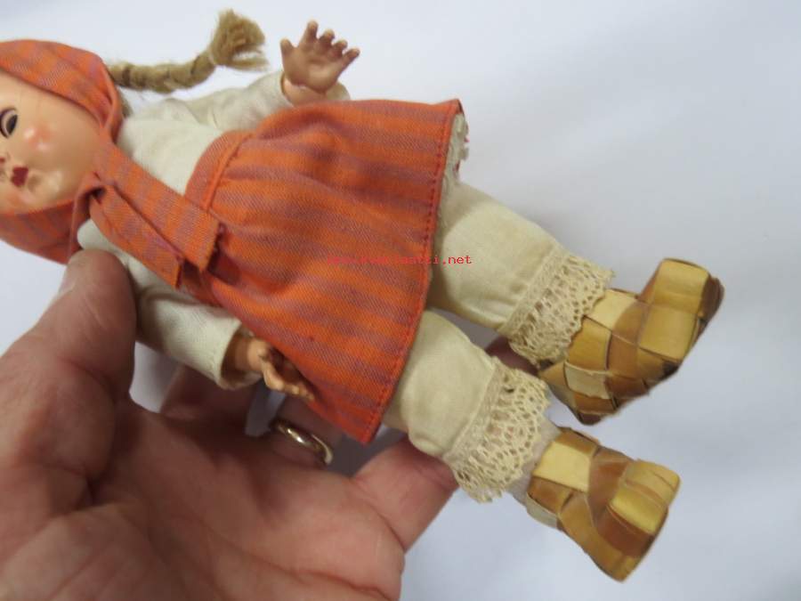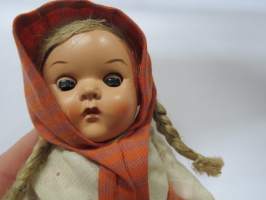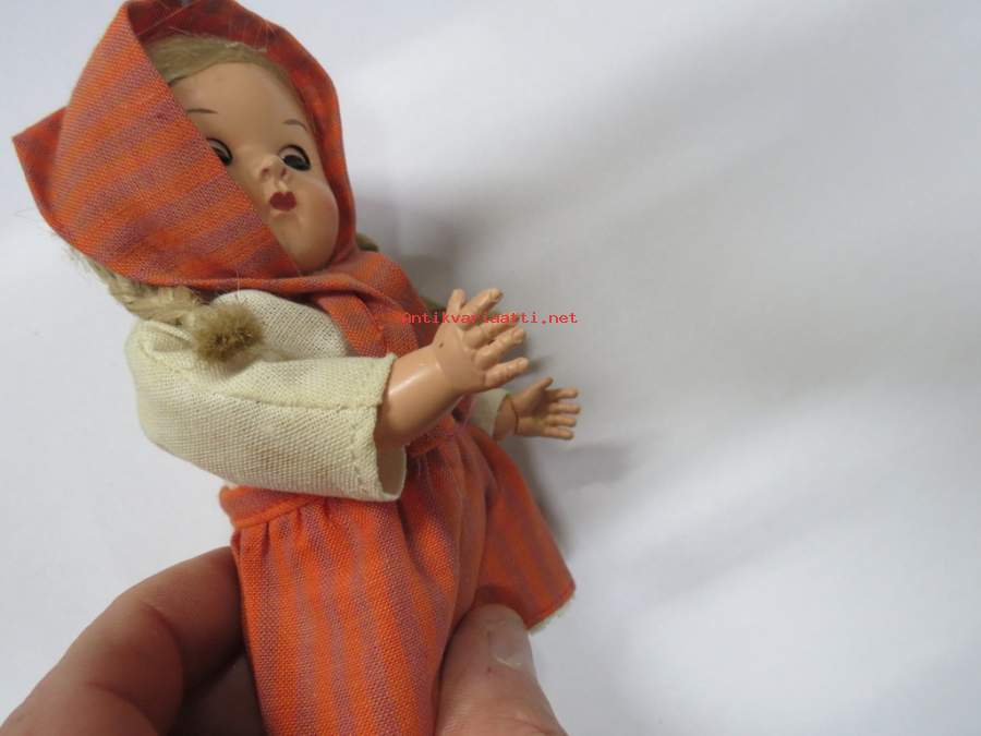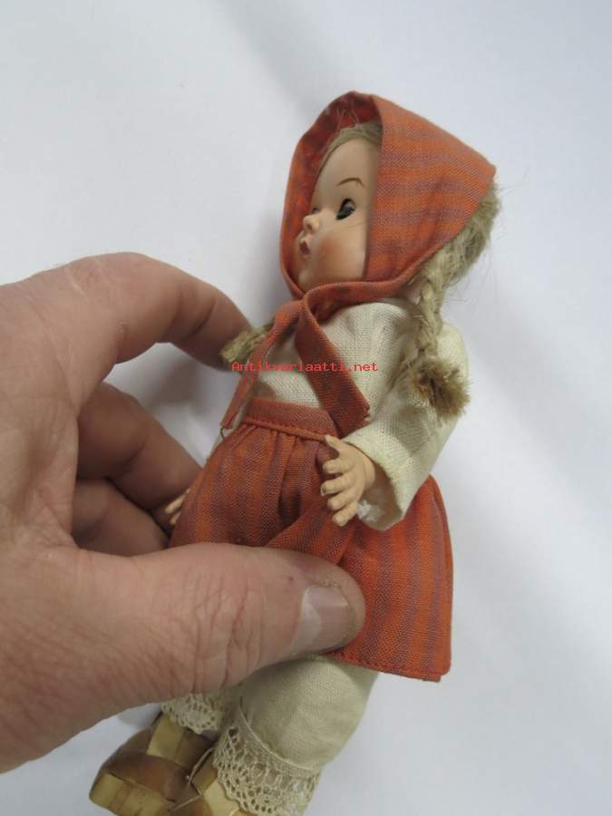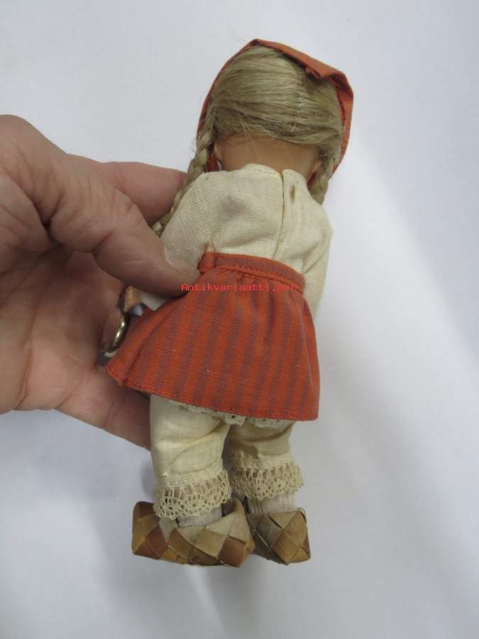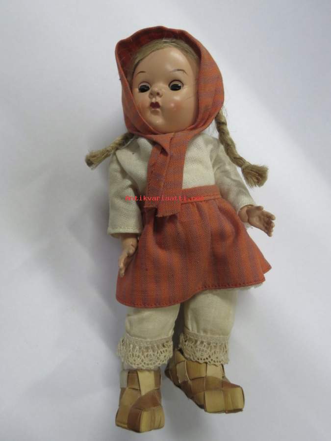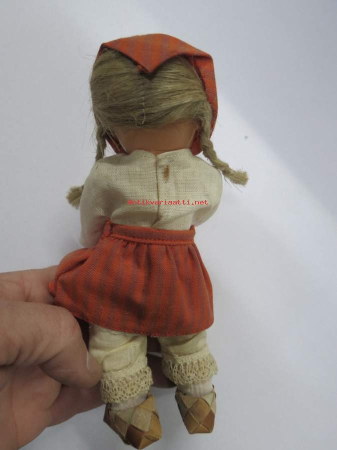 Matkamuistonukke ajalta ennen kiinakrääsää, tuohivirsutkin aitoa tuohta, hiukset aitoa kuitua - ei muovia. Avaa ja sulkee silmät kallistaessa. Korkeus 19 cm.