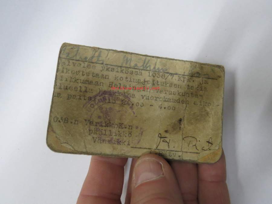 Lomatodistus 1038/7 kpk Iltalomatodistus nr 2 lähetti Kai Mäkinen, oikeutetaan liikkumaan H:gin varuskunta-alueella kaikkina vuorokauden aikoina, kotimajoitus Näytä