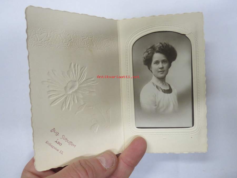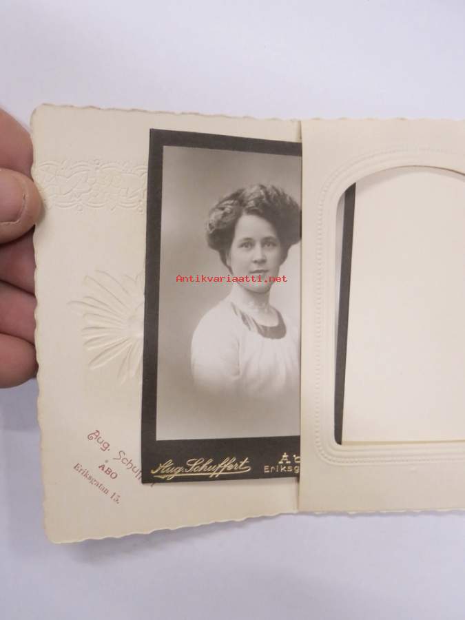 Atelier / valokuvaamo Aug. Schuffert, Turku -visiittikorttivalokuva /carte de visete / cdv, huomaa erikoinen (ja harvinainen) valokuvaamon nimellä oleva suojakotelo Näytä