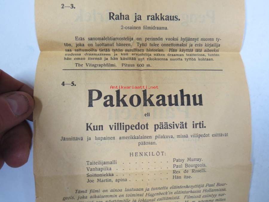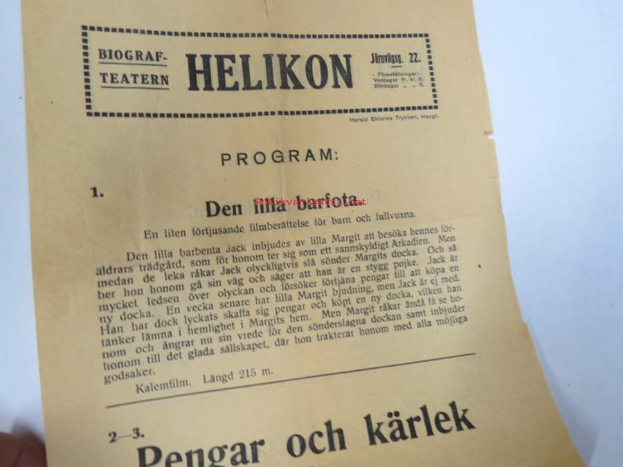 Elävienkuvienteatteri Helikon, Hanko -mainos / käsiohjelma, esitys ollut 19.11.1916; Pikku paljasjalkainen 215 metriä Kalemfilmi / Raha ja rakkaus 600 metriä...