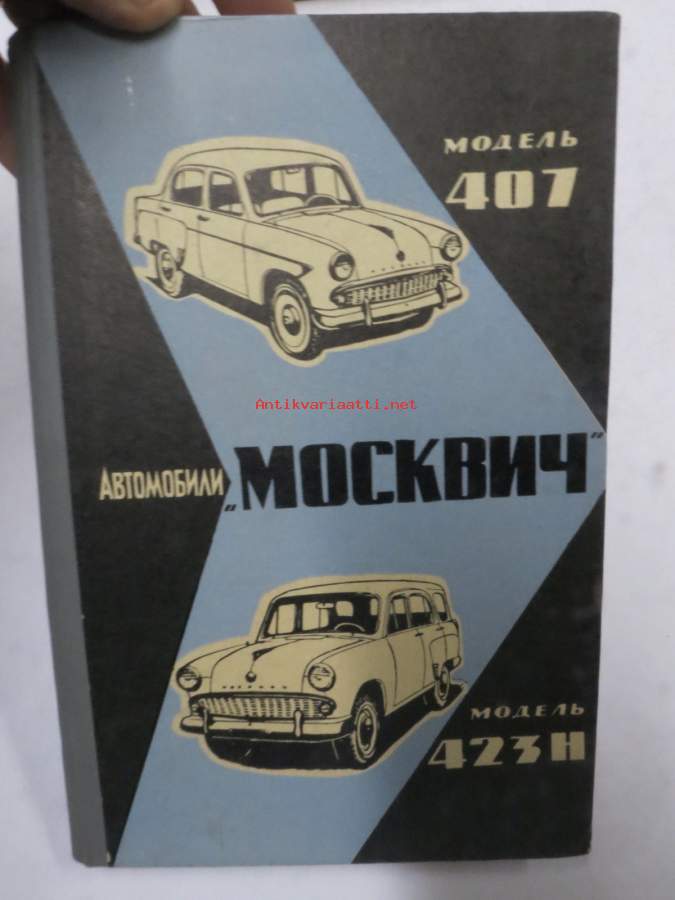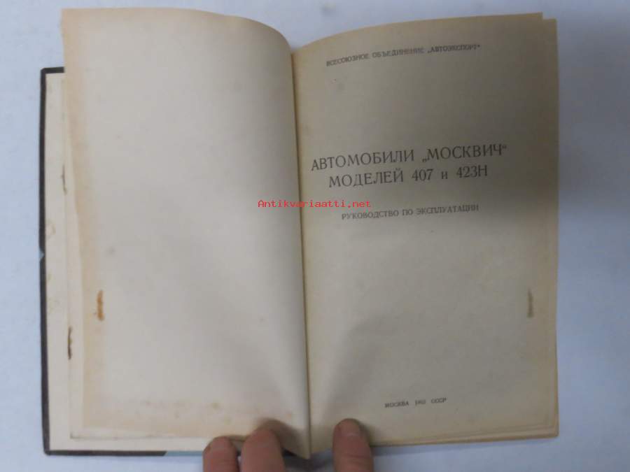 Москвич модель 407 - 423Н - Moskvitsh / Moskvits 407, 423N -käyttöohjekirja (+ akun hoito-ohjeet + varoituslappu kesäöljyistä), alkuperäinen auton mukana toimitettu