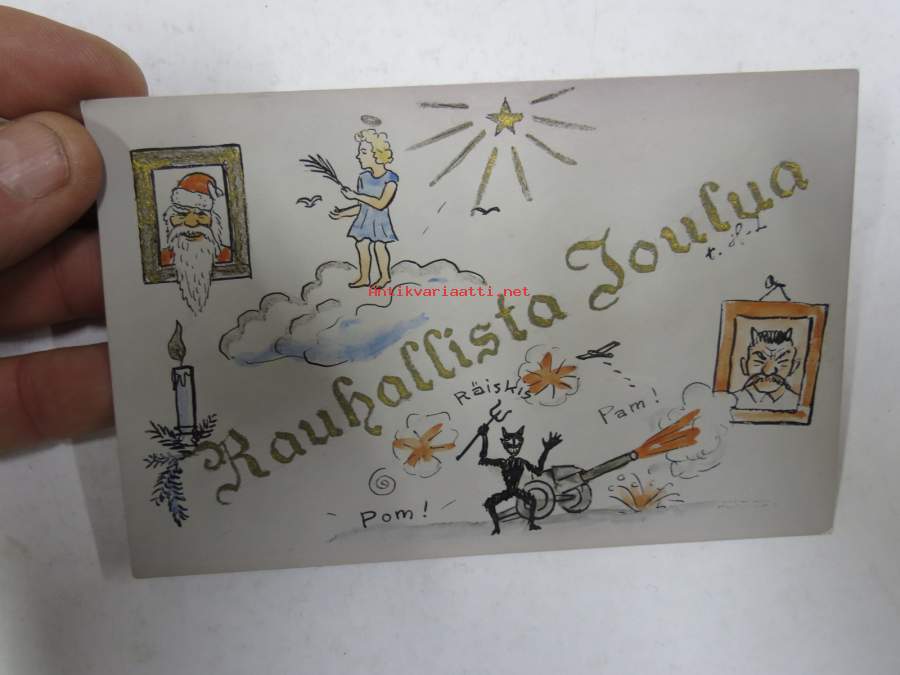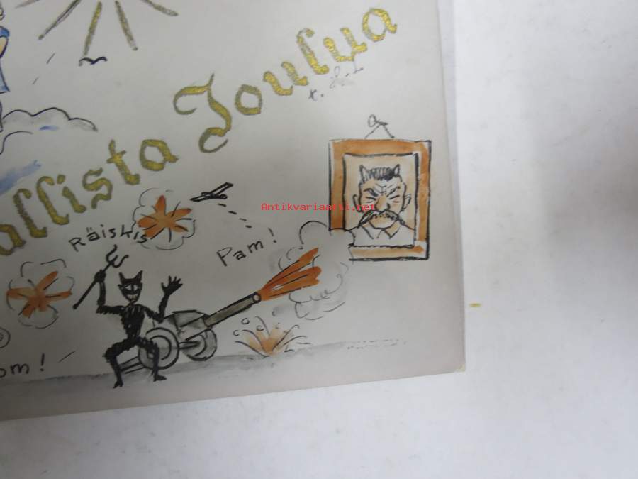 Rauhallista joulu, piirroskortti sota-ajalta, Piru hiilihanko kädessään ampuu tykillä pirunsarvisen Stalinin kuvaa, signeerattu H-L.