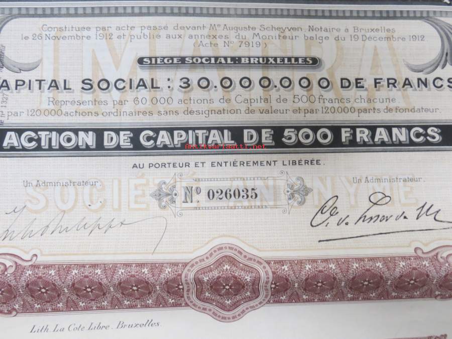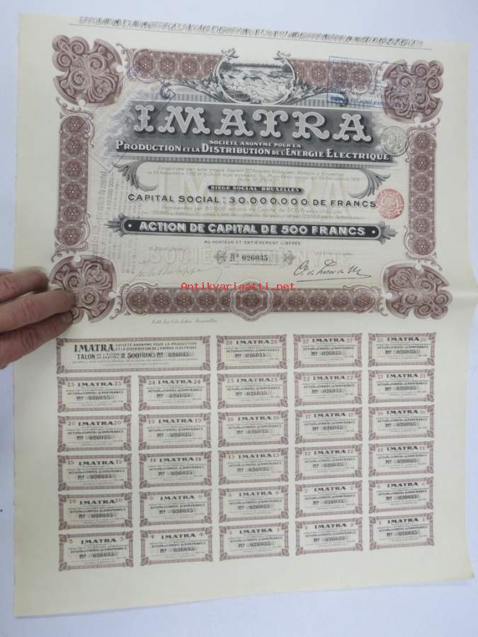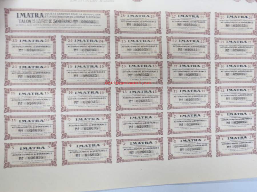 Imatra Sociéte Anonyme pour la Production et la Distribution de lÉnergie Electrique - Action ordinarie, nr 026035 -osakekirja / share certificate