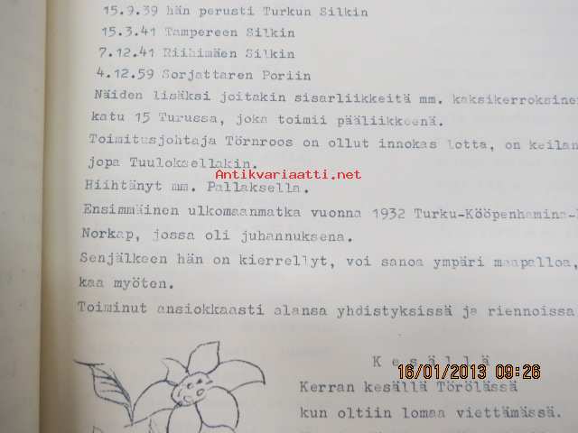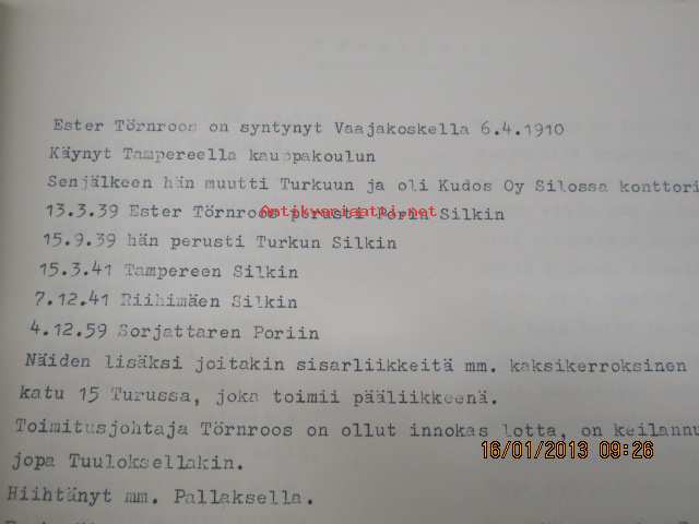 Törö 50 vuotta -monistettu lehti, jossa elämäkerrallisia piirteitä, lauluja, runoja ym. -Ester Törnroosin syntymäpäivän kunniaksi tehty. Työssä ja yrittäjänä mm. Kudos Oy Silo, Porin Silkki, Turun Silkki, Tampereen Silkki