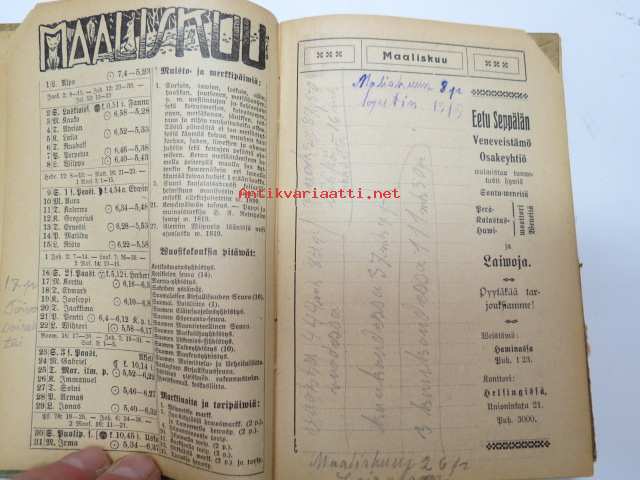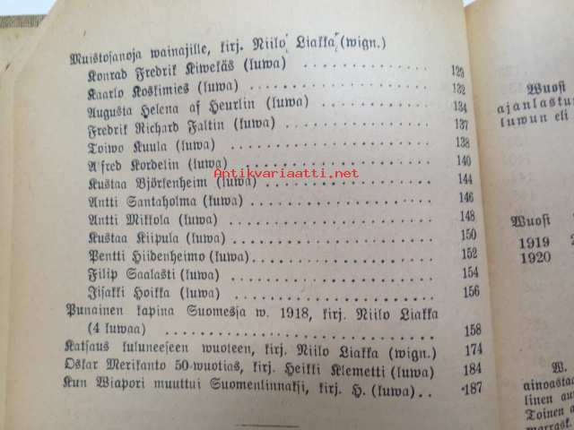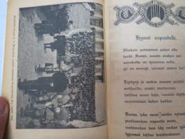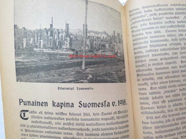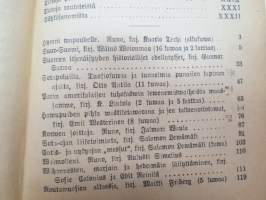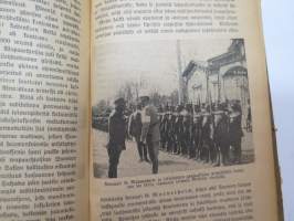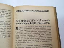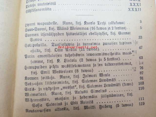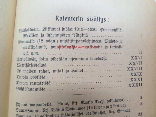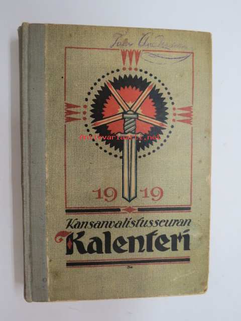 Kansanvalistusseuran Kalenteri 1919, sis. runsaasti mainoksia, artikkeleita, tilastotietoa, rautateitten ja postin kulku, virkamiehistö, puolueet, muistokirjoituksia jne., Väinö Voionmaa - Suur-Suomi, Gunnar Sarva - Suomen itsenäisyyden historialliset edellytykset, Otto antila - Sotapoluilla - tuokiokuvia ja tunnelmia punaisen kapinan ajalta, Emil Vesterinen - Havupuiden pihka vastiketavarana (korvikkkeena) ja sen talteenottotavat, Salomon Lewämäki - sota-ajan liiketoiminta, Sofie Calonius & Edit Reinilä - Wihannesten marjain ja hedelmäin säilyttäminen, Niilo Liakka - Punainen kapina Suomessa, täydellinen sisällysluettelo kuvissa -calendar with articles
