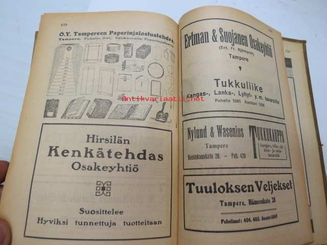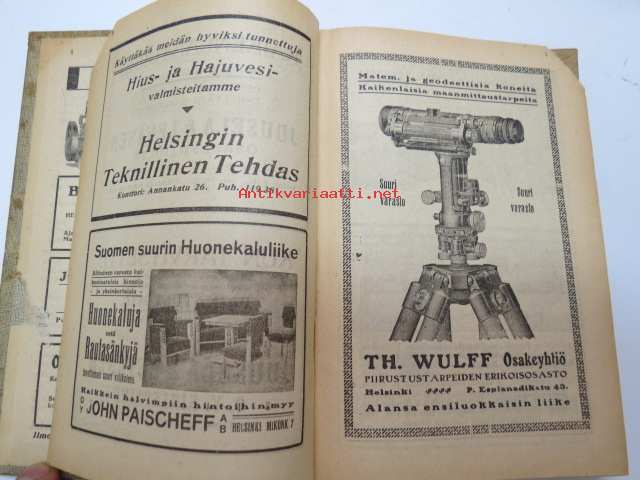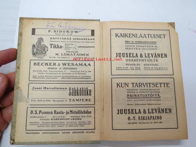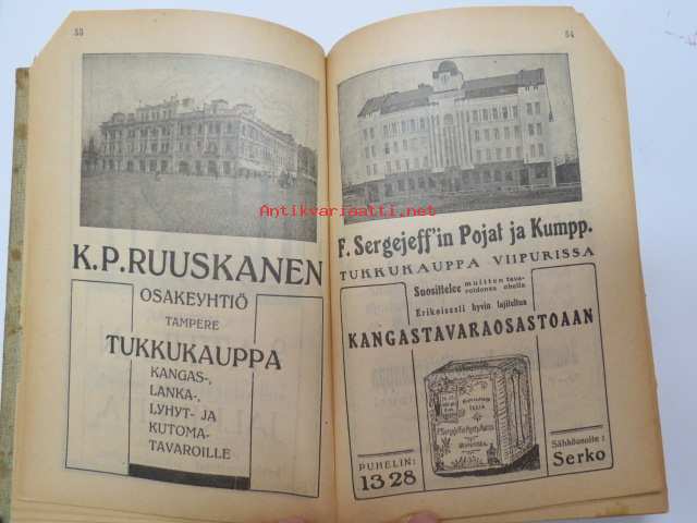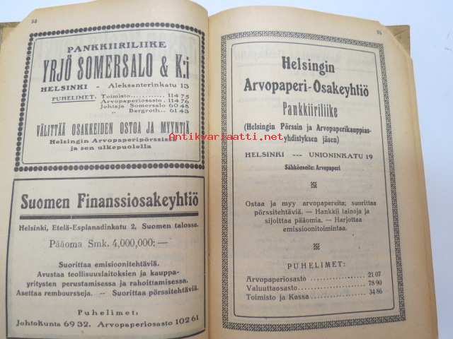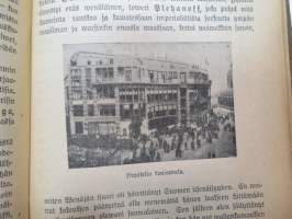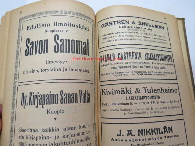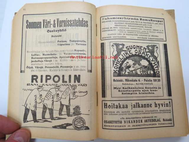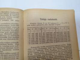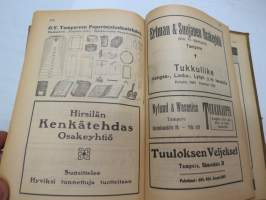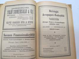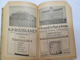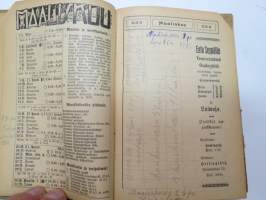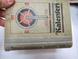 Kansanvalistusseuran Kalenteri 1919, sis. runsaasti mainoksia, artikkeleita, tilastotietoa, rautateitten ja postin kulku, virkamiehistö, puolueet,