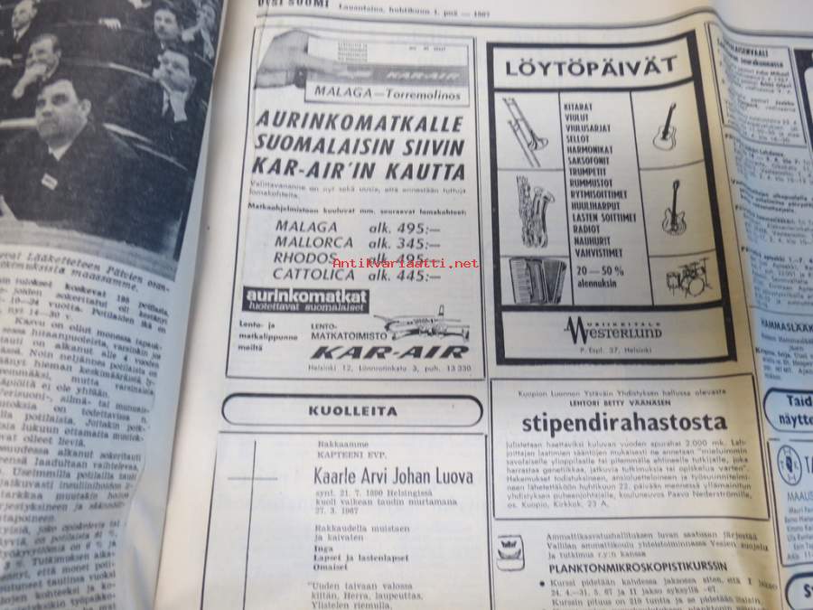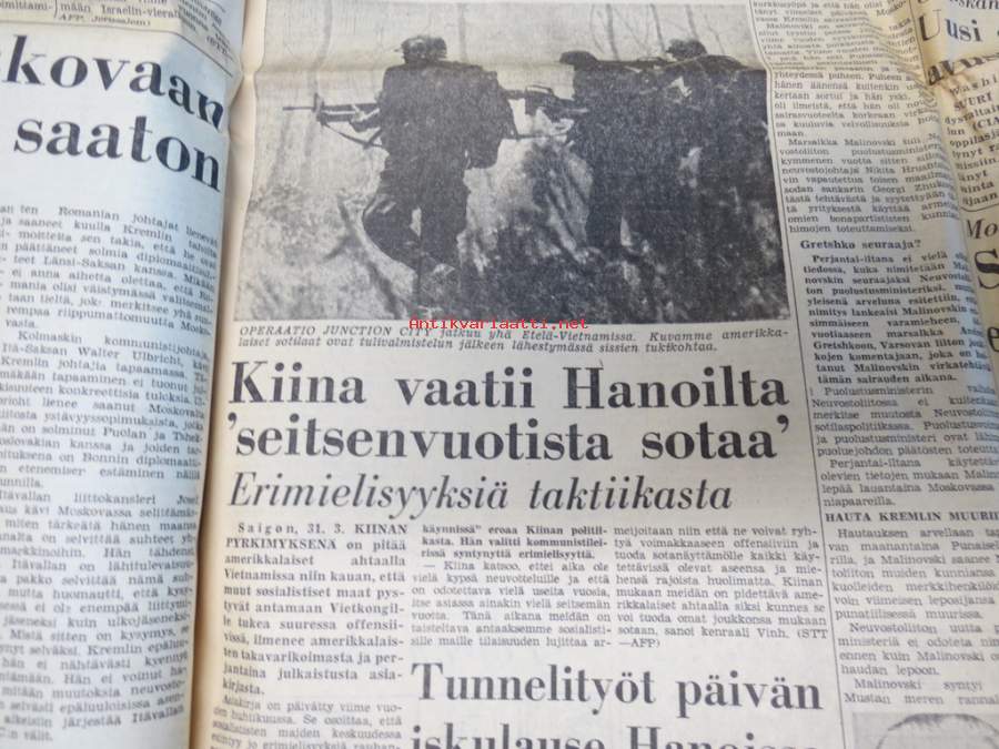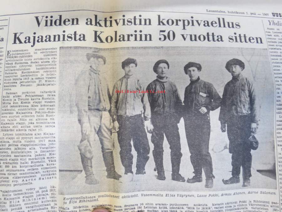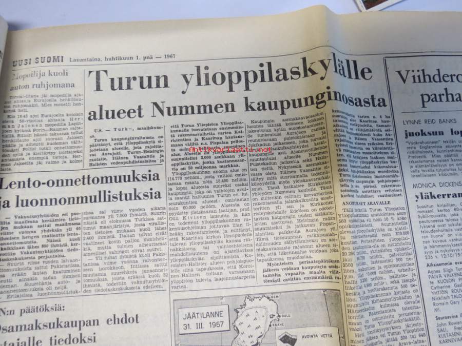 Aamulehti la 1.4.1967, Kolarin malmirata?, MS Finalndia mainos, Amerikkalainen miljonääri Frans Nieminen etsii perillisiä, Urjalan putka kuin leikkimökki, ym. Näytä