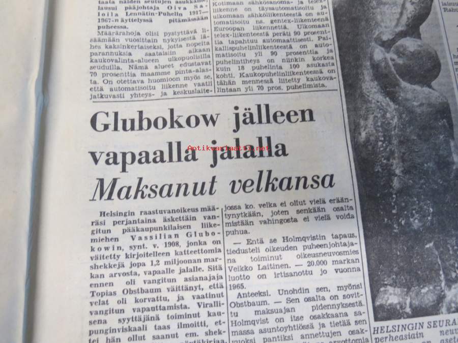 Uusi Suomi la 1.4.1967, Kansanedustaja vapaan oluen kannalla, Linnanmäen näkötorni, Aktivistivaellus 50 vuotta sitten, sekkipetturi Vassilian Glubokov, ym.