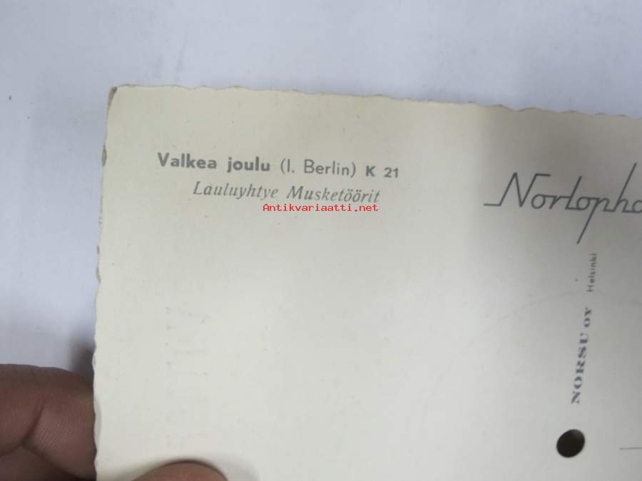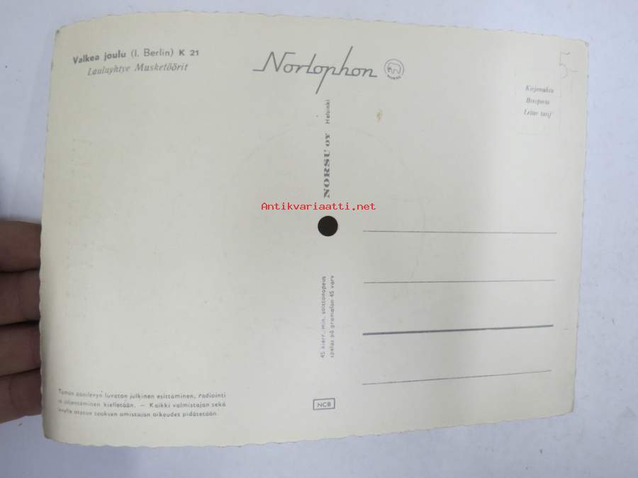 Hyvää Joulua - Valkea joulu - Lauluyhtye Musketöörit, Norlophon / Norsu Oy -äänilevypostikortti 45 rpm postcard
