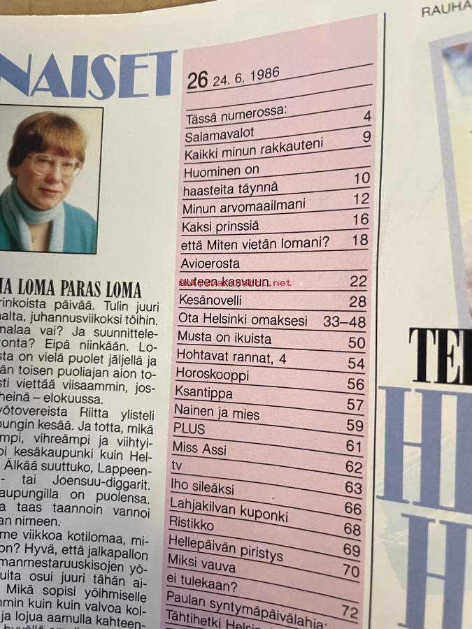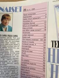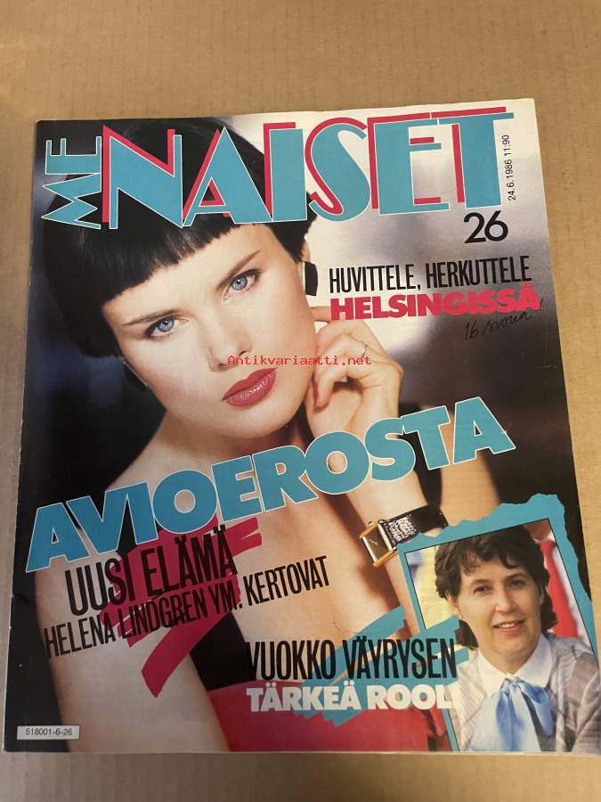 Me Naiset 1986 nr 26 (24.6.), avioerosta uusi elämä Helena Lindgren ym. kertovat, Kyllikki Forsell, Matti Kuusla, Miikka Ruokanen, ota iloksesi Helsinki Näytä