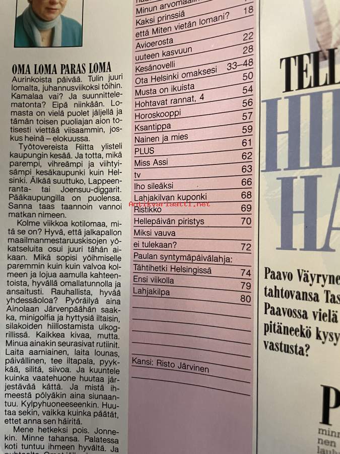 Me Naiset 1986 nr 26 (24.6.), avioerosta uusi elämä Helena Lindgren ym. kertovat, Kyllikki Forsell, Matti Kuusla, Miikka Ruokanen, ota iloksesi Helsinki