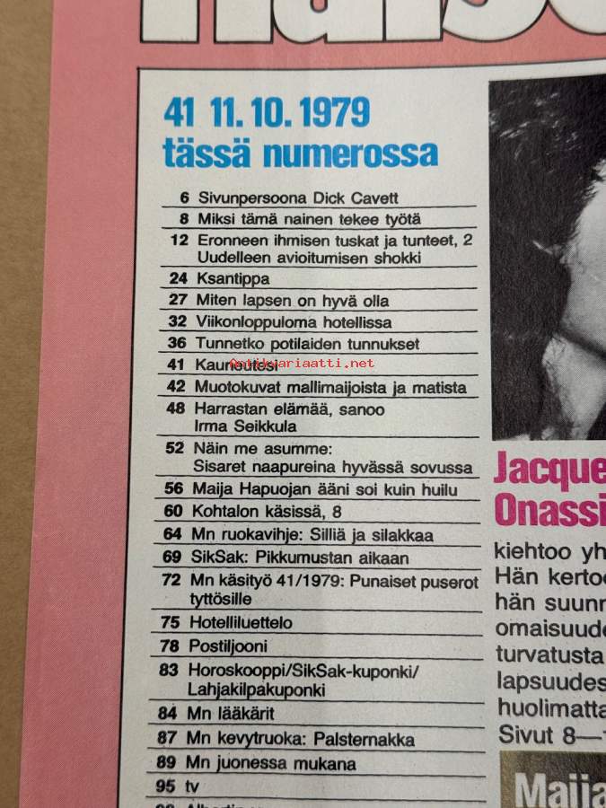 Me Naiset 1979 nr 41, Armi Ratian viimeinen haastattelu, Maija Hapuoja, Näin me asumme - Marjut ja Seppo Mykrä ja Pirkko ja Jukka Silaste