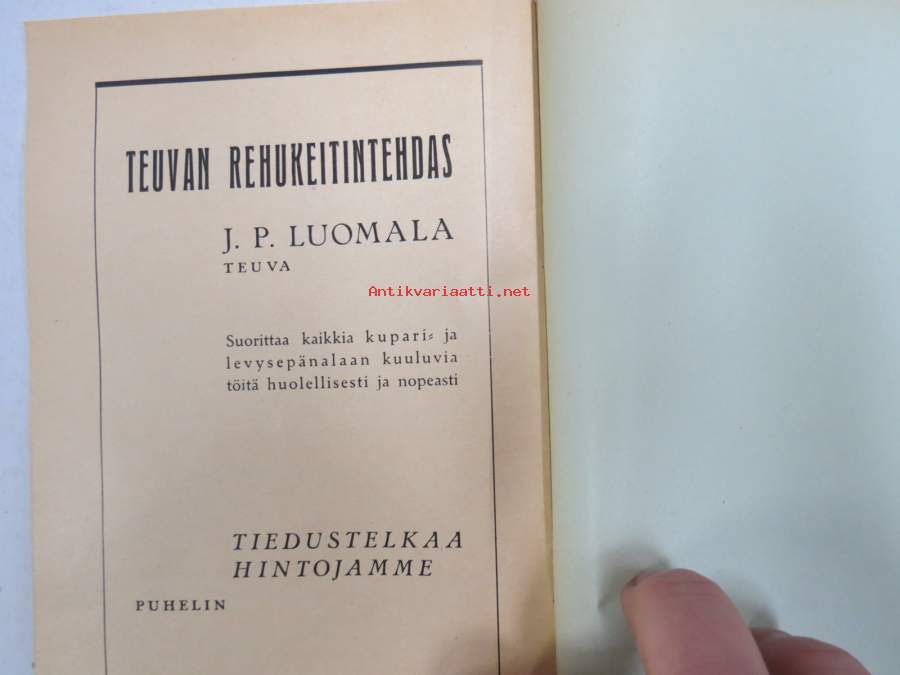 | Saatavilla | 0 kpl (Huom. tuote on myyty! / Sold out!) | | Julkaisuvuosi | 1936 | | Sivuja | 12 | | Kunto | K3 | | Sidonta/painoasu | Pienpainate | | Kielet | Suomi |