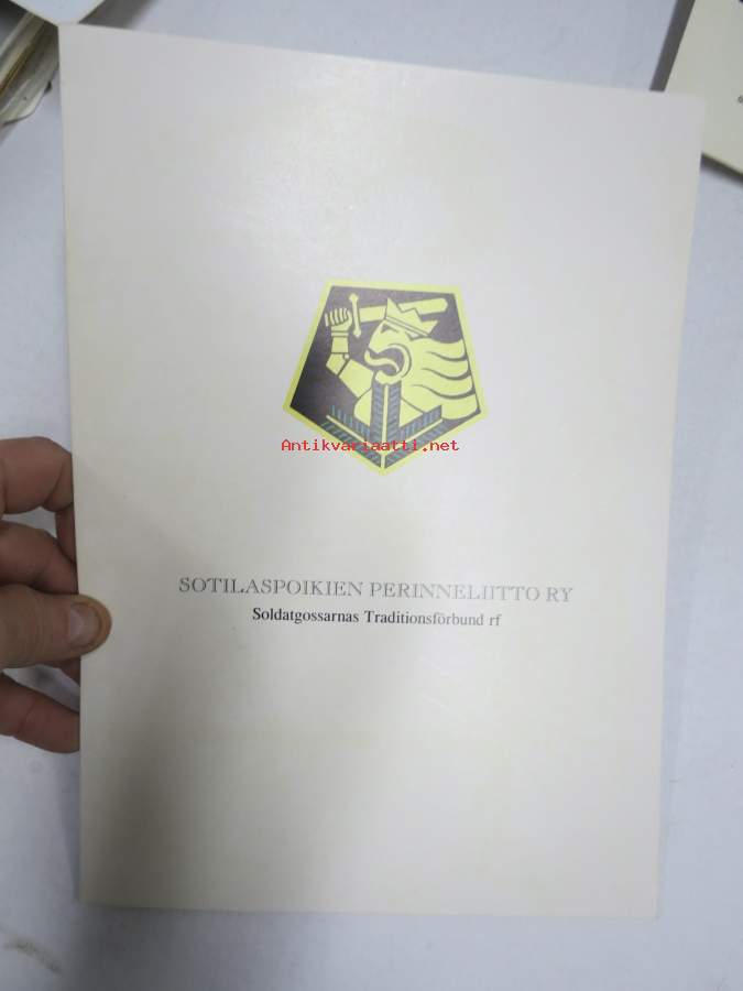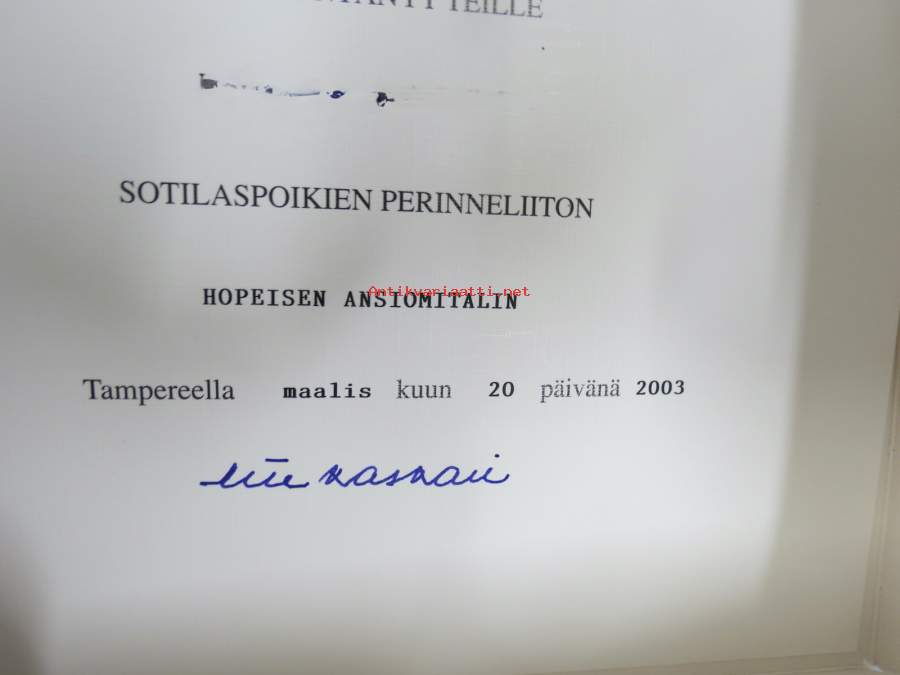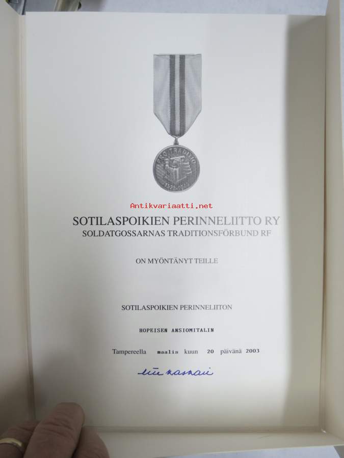 Sotilaspoikien Perinneliitto ry - Soldatgossarnas Traditionsförbund rf -hopeinen ansiomitali -myöntökirja (saajan nimi retusoitu kuvasta, on OK itse myöntökirjassa Näytä