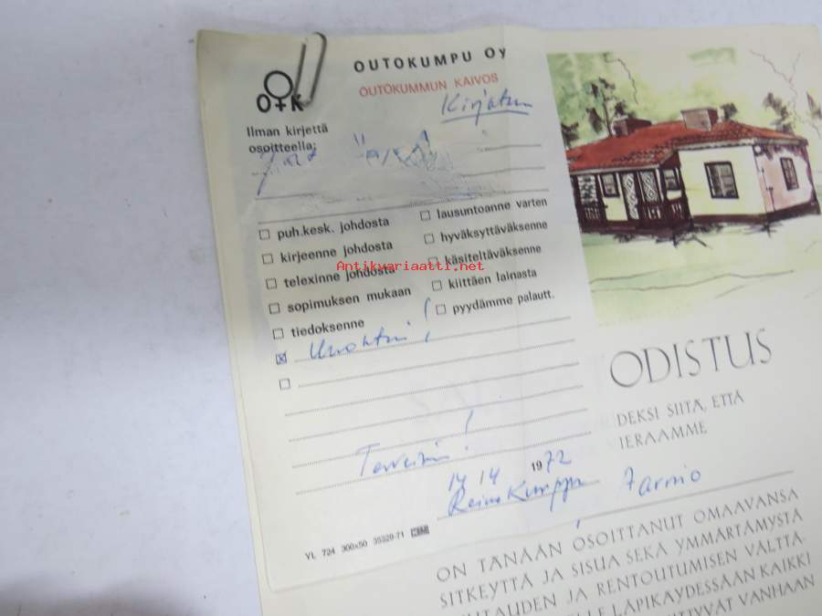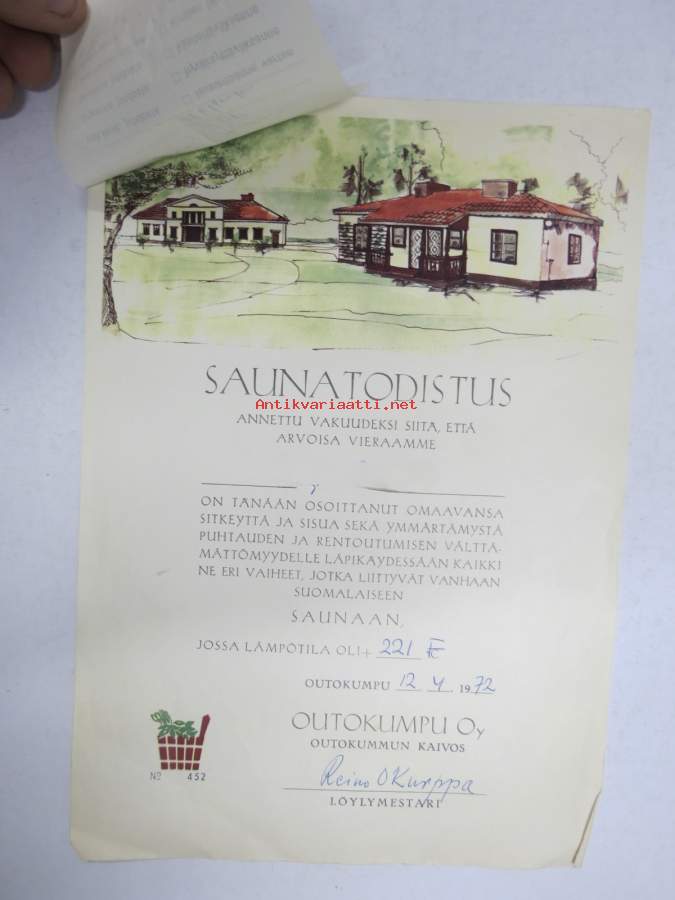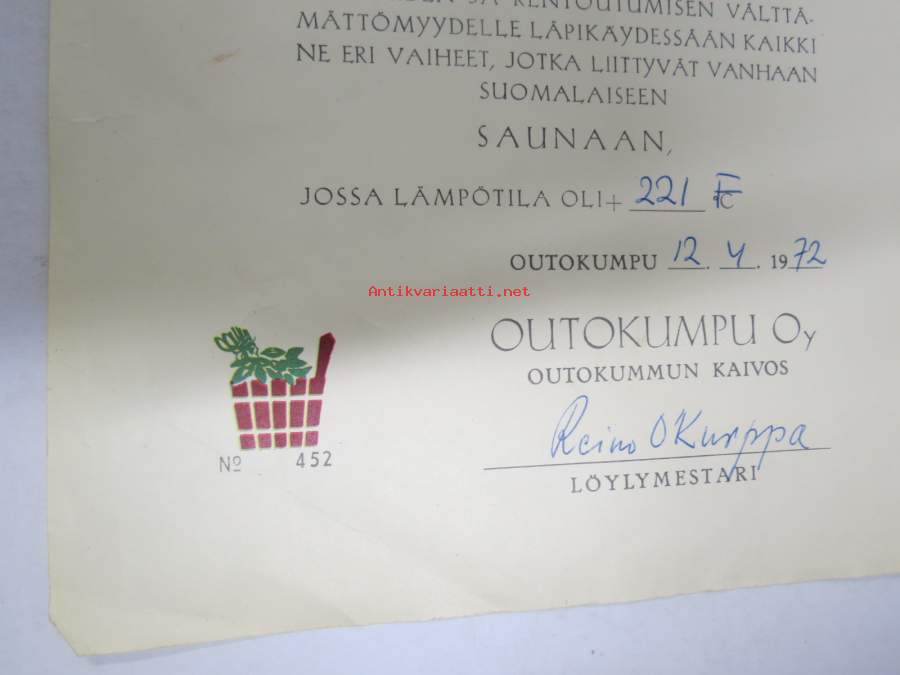 Outokumpu Oy - Outokummun kaivos - Saunatodistus nr 452 v. 1972 -myöntökirja (saajan nimi retusoitu kuvasta, on OK itse myöntökirjassa