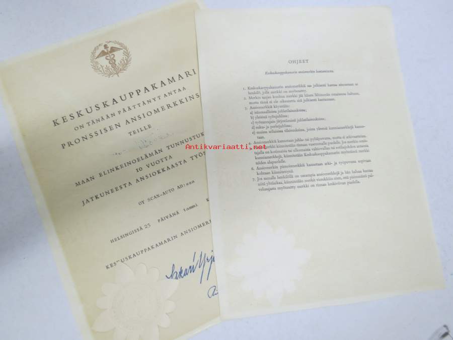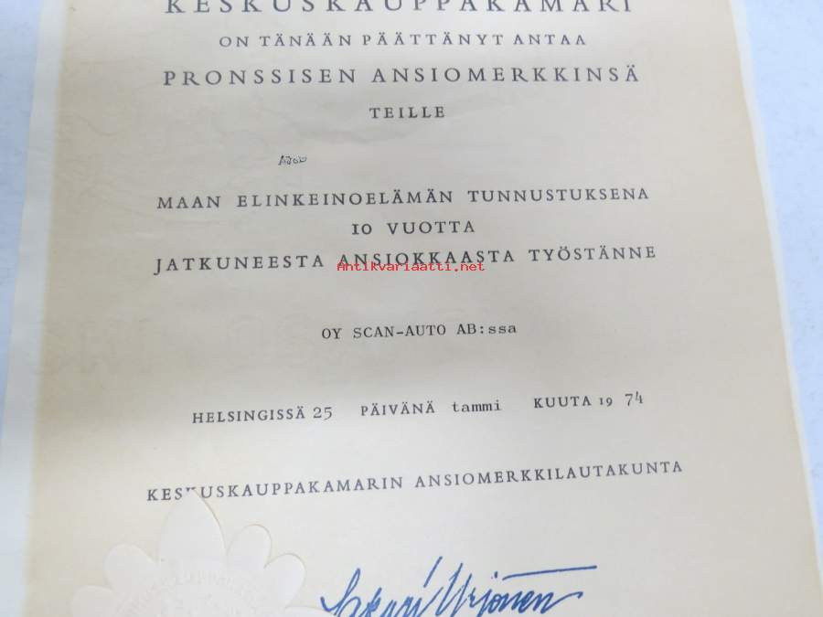 Keskuskauppakamari - Pronssinen ansiomerkki -myöntökirja (saajan nimi retusoitu kuvasta, on OK itse myöntökirjassa