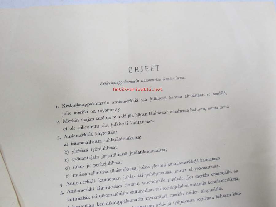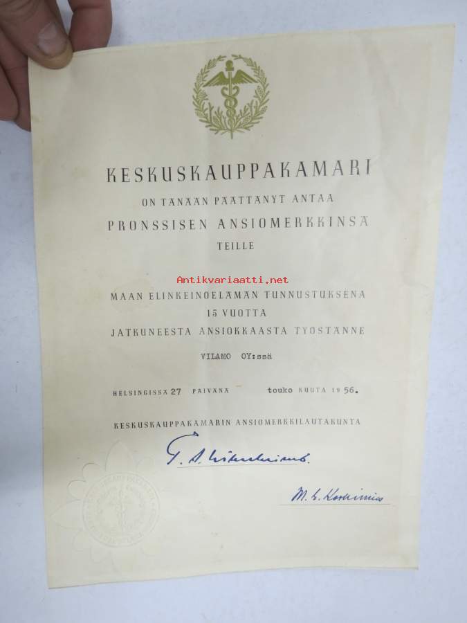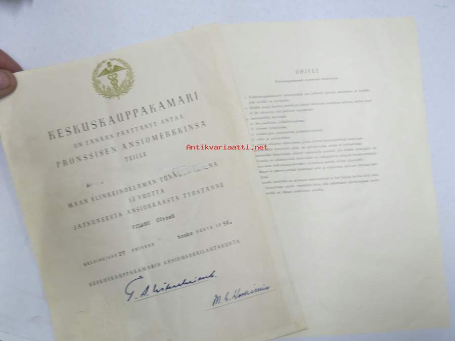 Keskuskauppakamari - Pronssinen ansiomerkki -myöntökirja (saajan nimi retusoitu kuvasta, on OK itse myöntökirjassa