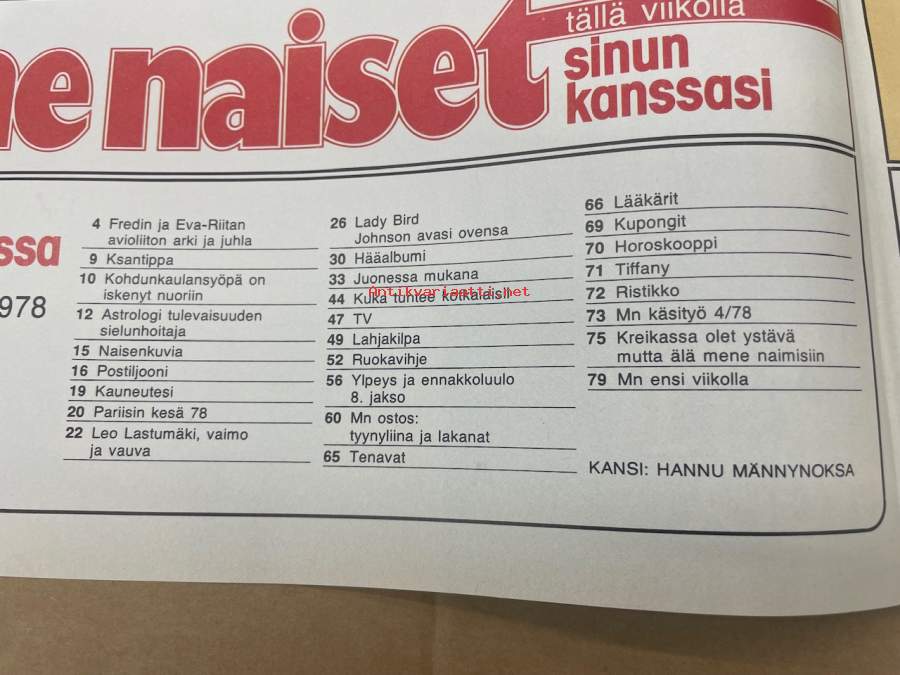 Me Naiset 1978 nr 4, Fredi ja Eeva-Riitta, Pirkko Mannolan vaikein rooli, Leo Lastumäki, Anne Pohtamo ja Jacques, Sivun persoona Seppo Tamminen