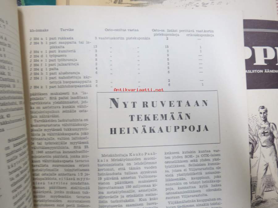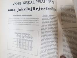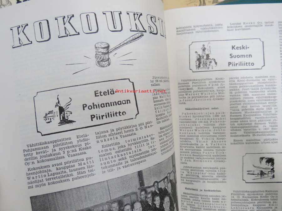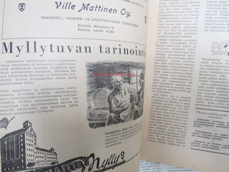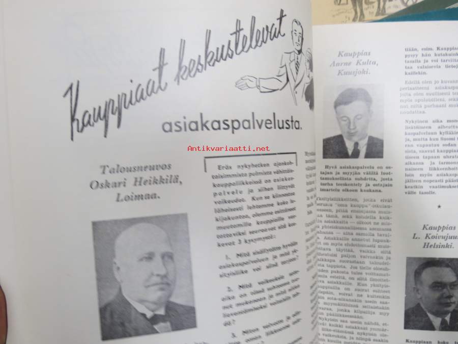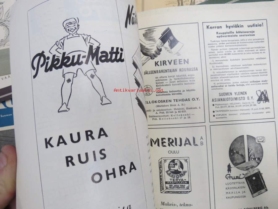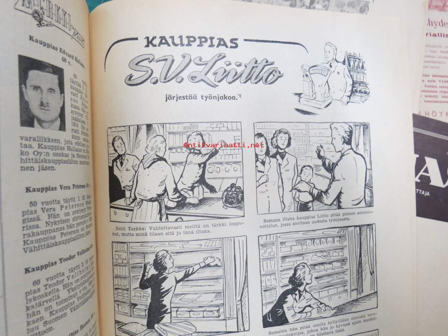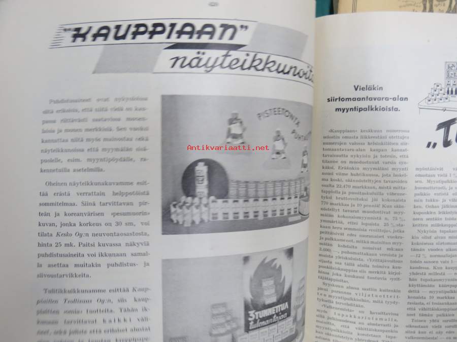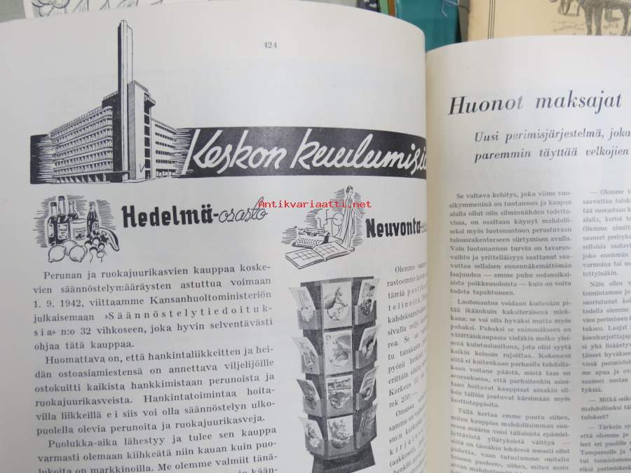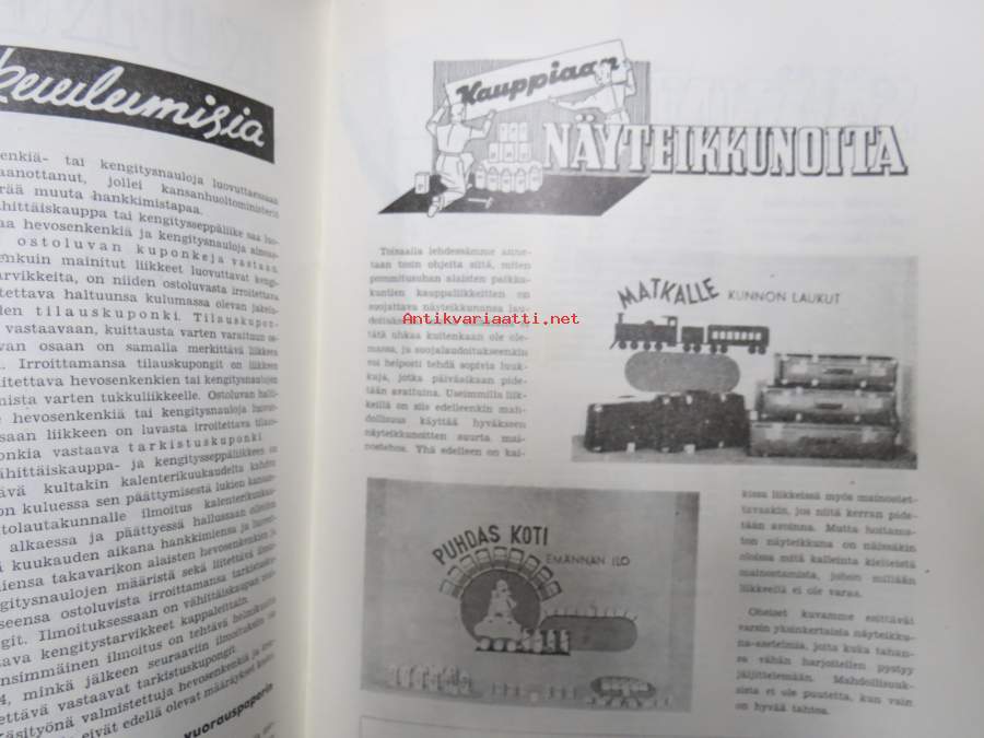 Kauppias -lehtiä noin 40 kpl erä vv. 1942-53, lehdissä runsas sisältö ja ajankuvaa, paljon mainoksia, tuotemerkkejä, asia-artikkeleita, pula-ajan asiaa yms. Näytä