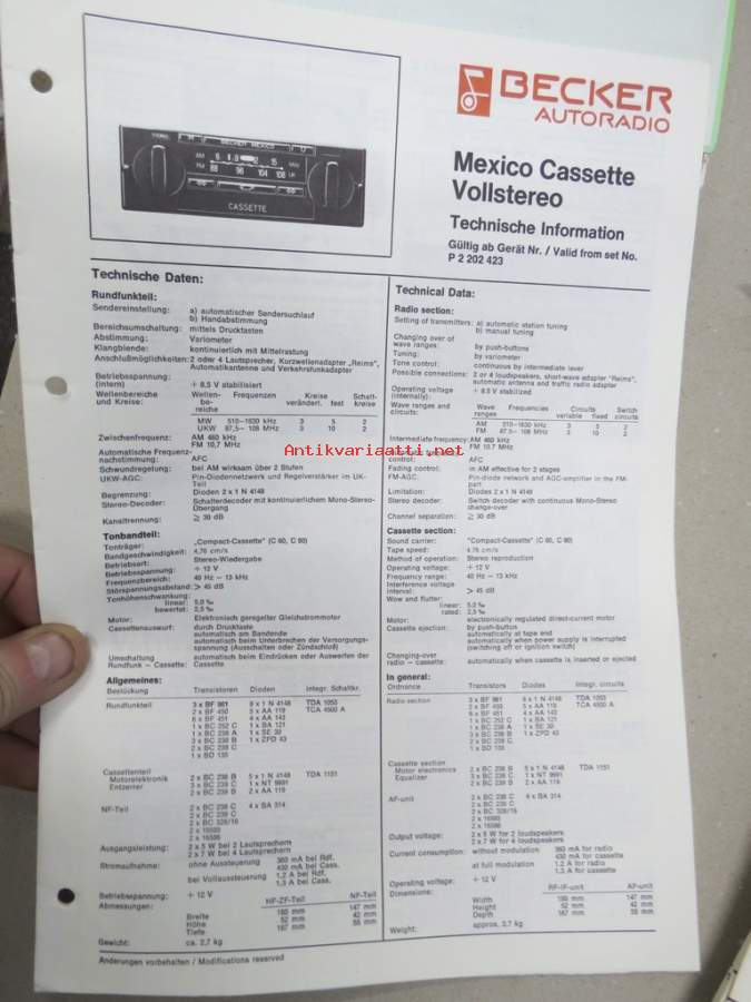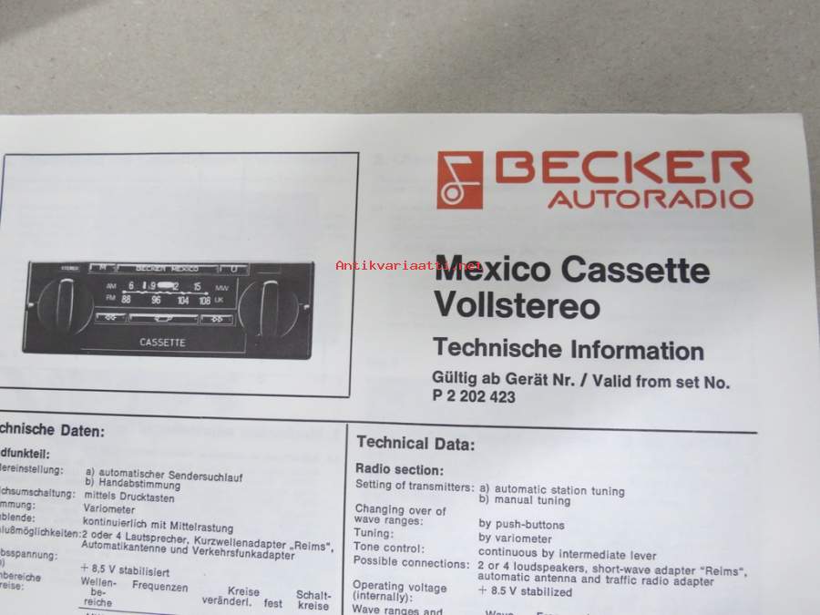 Becker Mexico Cassette Vollstereo - Technische Information / Technical Data -tekniset tiedot, kytkennät, korjaus, varaosat