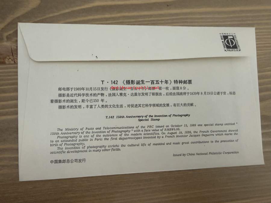 Kiina 16.10.1989 - T. 142 The 150th Anniversary of the Birth of Photography - FDC / Ensipäivänkuori