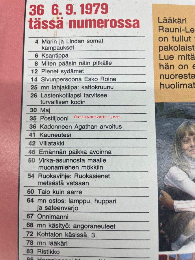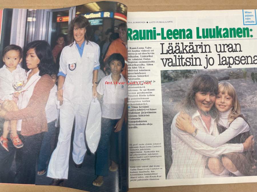 Me Naiset 1979 nr 36 (6.9.), Rauni-Leena Luukanen, sivun persoona Esko Roine, emännän paikka avoinna, Carola ja Berndt Nordgren muonamiehen mökki, Lupajan koulu Näytä
