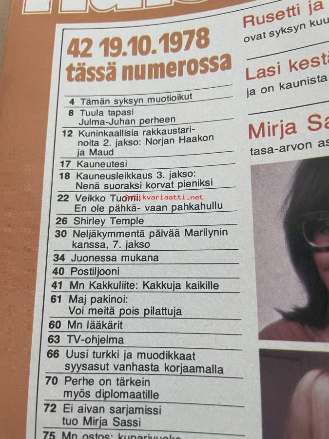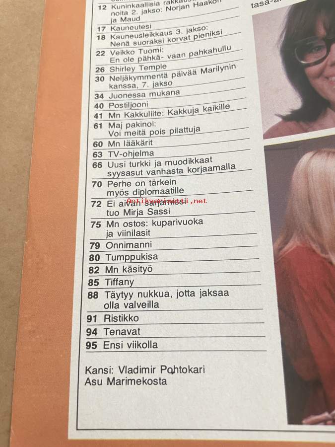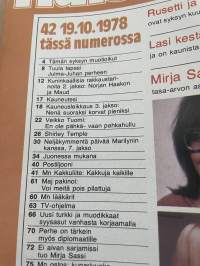 Me Naiset 1978 nr 42 (19.10.), Juha Väätäinen, Veikko Tuomi, Shirley Temple, neljäkymmentä päivää Marilynin kanssa osa 7, Yrjö Tuominen, Salvador Dali