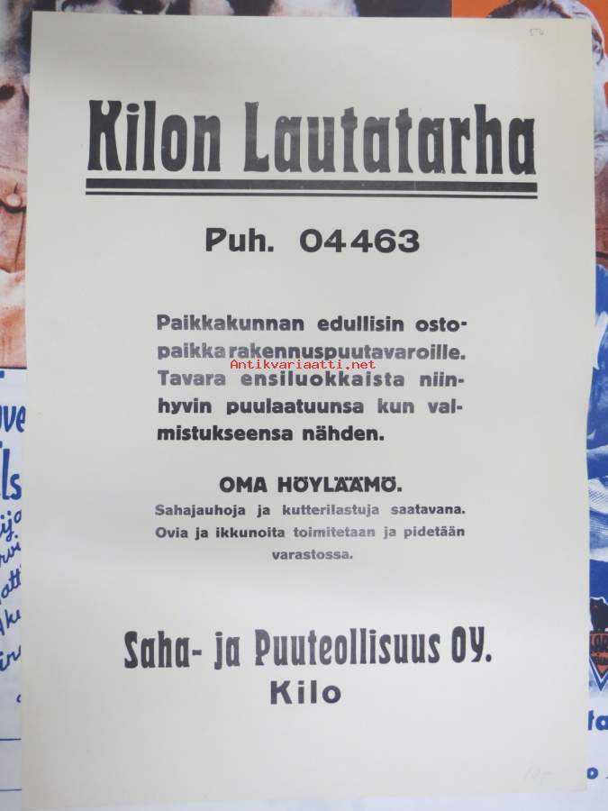 Kilon Lautatarha - Saha- ja Puuteollisuus Oy, Kilo (Espoo) -mainosjuliste
