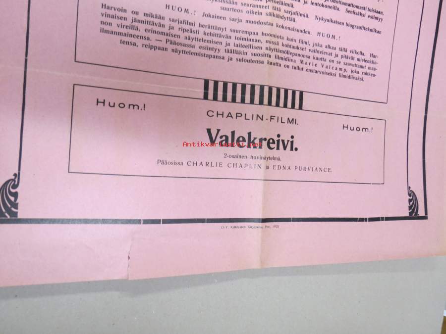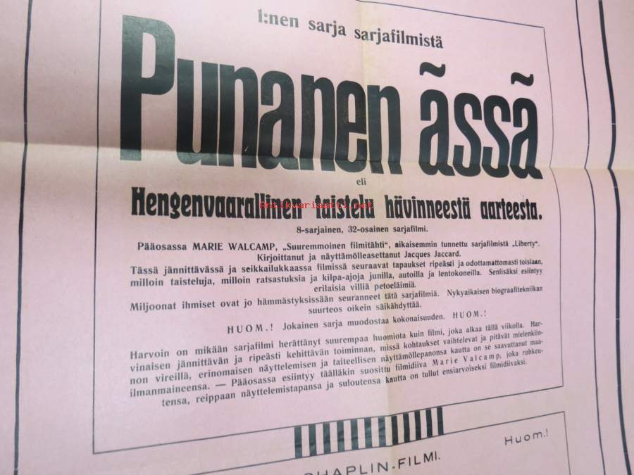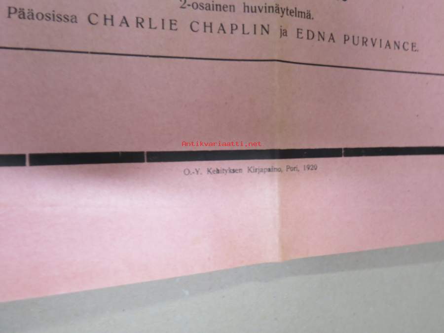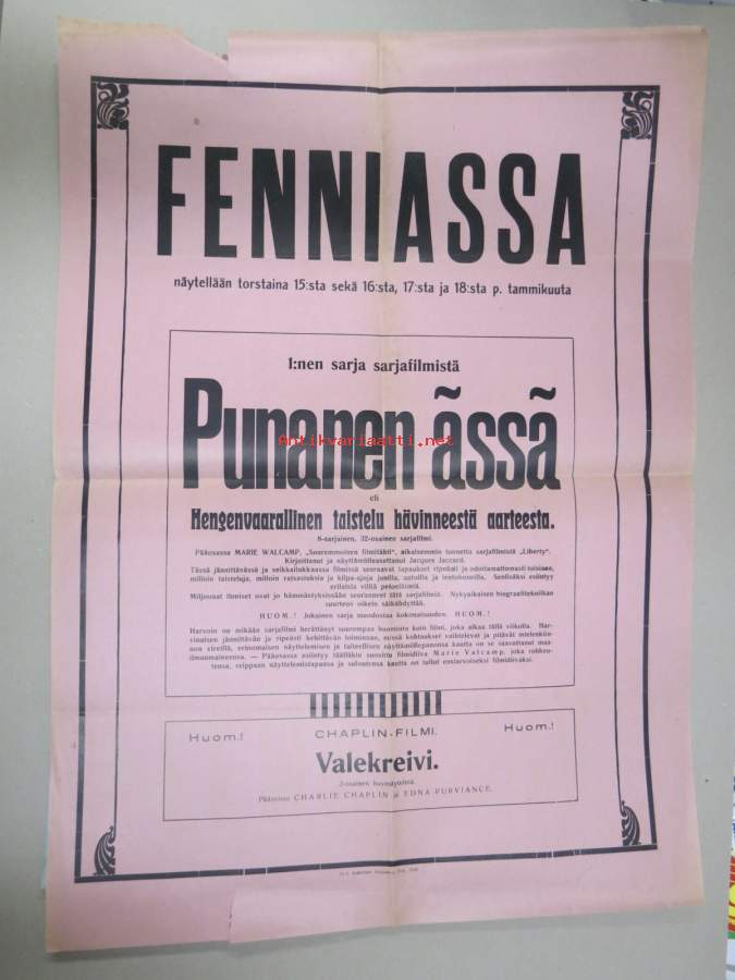 Elokuvateatteri Fennia (Pori?) - Punanen ässä + Charlie Chaplin-filmi Valekreivi -mykkäfilmi 1920 -elokuvajuliste