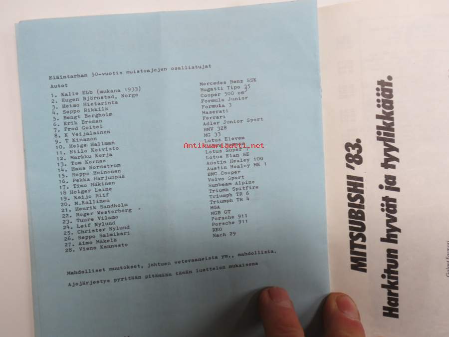 Puijon Miljoona-ajot 16.9.1951 -käsiohjelma + harvinainen "Autojen moottoripyörien erikoismaaäykset" eli kilpailusäännöt (vain talleille / kuljettajille tarkoitetut)