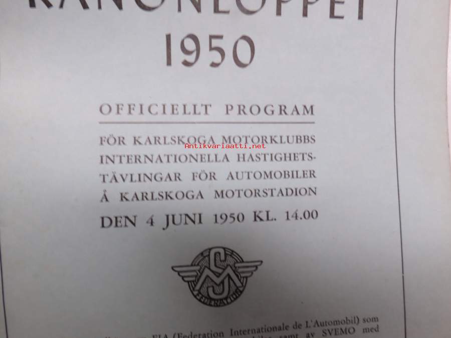 Kanonloppet 1950 Officielt program -käsiohjelma, mm. suomalainen Evert Saloranta Ford V8 -vaunullaan osallistujana