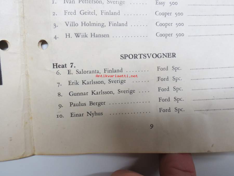 Flatenloppet 1950 -käsiohjelma, mm. suomalainen Evert Saloranta Ford V8 -vaunullaan osallistujana