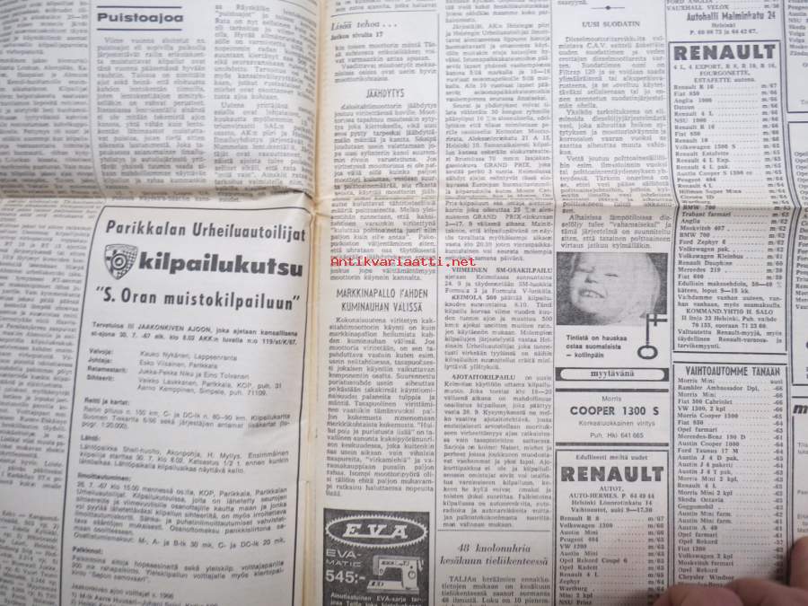Moottoriviesti 1967 nr 1, Kaniskuva Monte Carlo 1. Aaltonen - Suomi, VW Variant testiä, Opel Kadett testiä, VW 1500 testiä, Volvo 144 S koeajo (3 sivua)...