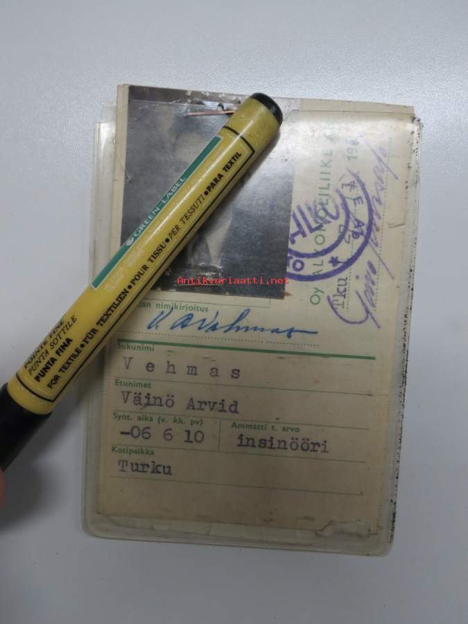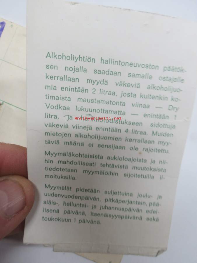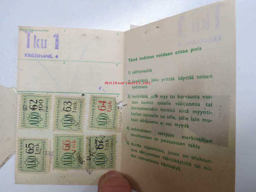 Oy Alkoholiliike Ab myymälätodistus "viinakortti" ALKO-leimamerkkeineen, "insinööri V.A. Vehmas" 1962, Turku