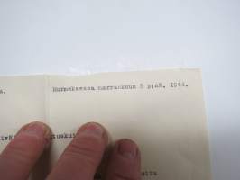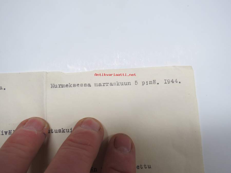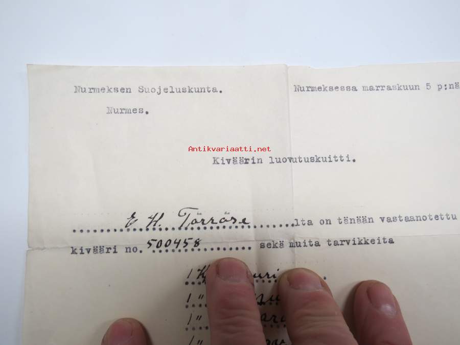 Murmeksen Suojeluskunta, Nurmes, 5.11.1944 Kiväärin luovutuskuitti - E.H. Törrönen, kuitannut alik. H.V. Kuittinen
