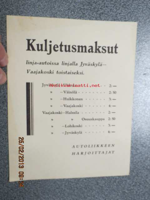 Kuljetusmaksut linja-autoissa linjalla Jyväskylä-Vaajakoski toistaiseksi -aikataulumainos