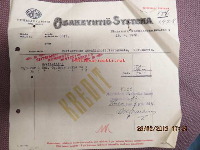 Oy Systema. Aleksanterinkatu 7, Hki 18.4.1928 hyvityskuitti