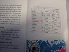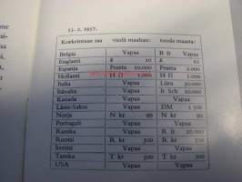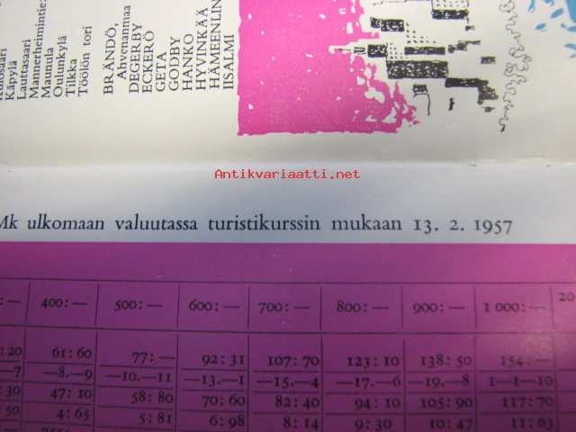 Ohjeita ulkomaille matkustaville Helsingin Osakepankki esite 1957, sisältää mm. markka ulkomaan valuutassa 13.2.1957 turistikurssin mukaan