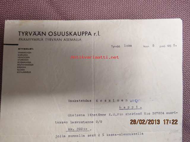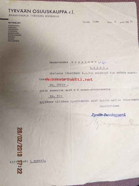 Tyrvään osuuskauppa, saatekirje 5.10.1935