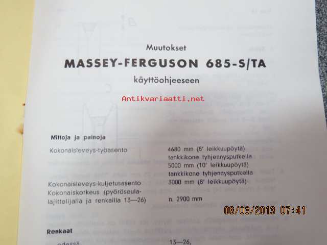 Massey Ferguson leikkuupuimuri 685 S / TA -lisäliite käyttöohjeeseen