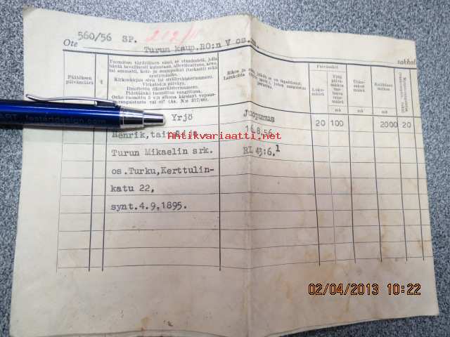 Turun kaupungin raastuvanoikeuden sakkoluettelo, taiteilija Y.K., juopumus 8.8.1956, päiväsakkoja -asiakirja